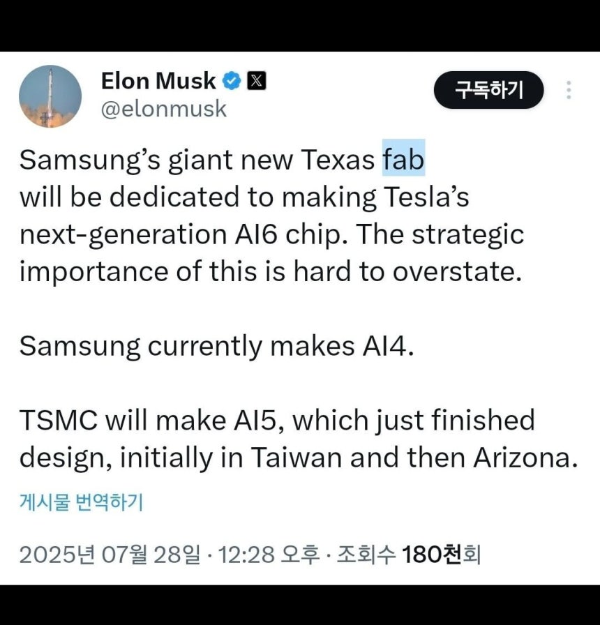 일론 머스크 테슬라 CEO가 직접 소셜미디어를 통해 발표한 내용에 따르면, 삼성전자의 새로운 텍사스 공장이 테슬라의 차세대 AI6 칩 생산을 전담하게 됩니다. 이는 삼성전자의 파운드리 기술력이 세계 최고 수준임을 인정받았다는 것을 의미합니다